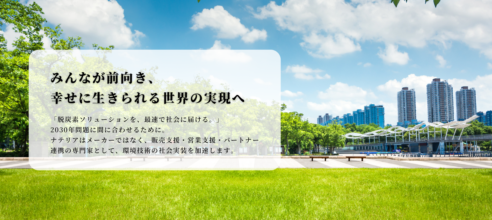 株式会社ナテリアは、2030年問題をはじめとする地球規模の課題に立ち向かうために生まれました。私たちはメーカーではありません。私たちの役割は、優れた環境技術やサービスを社会に広げることです。